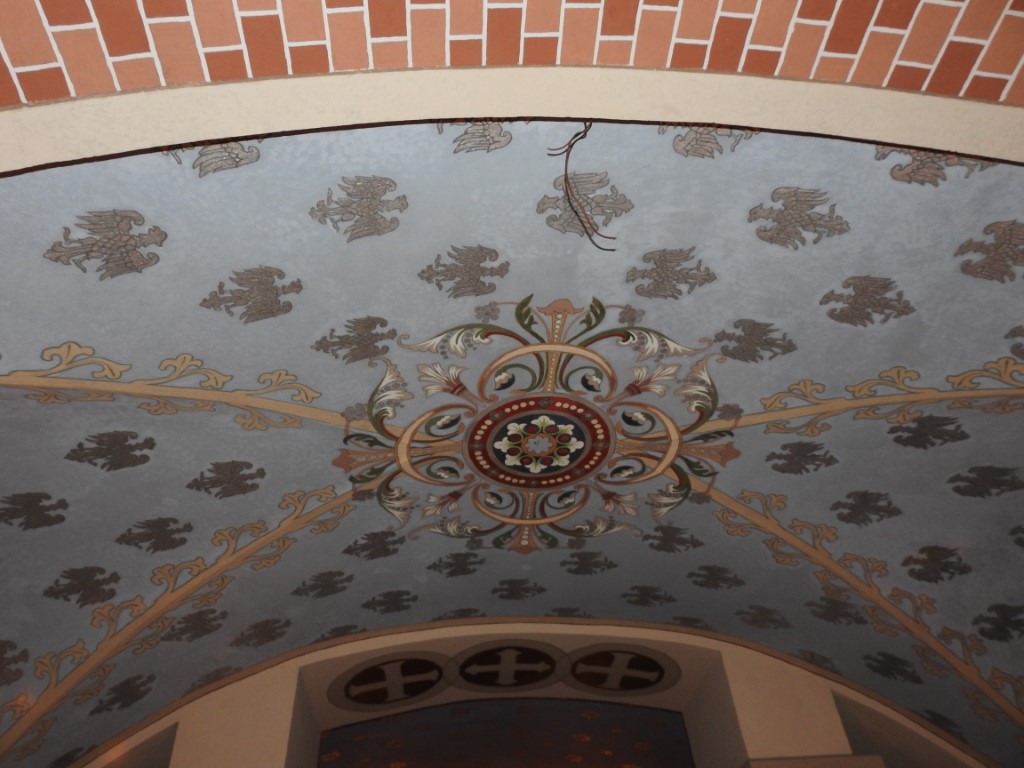 Wnętrze krypty charakteryzuje się surową, sakralną atmosferą z wyraźnymi elementami neoromańskimi: