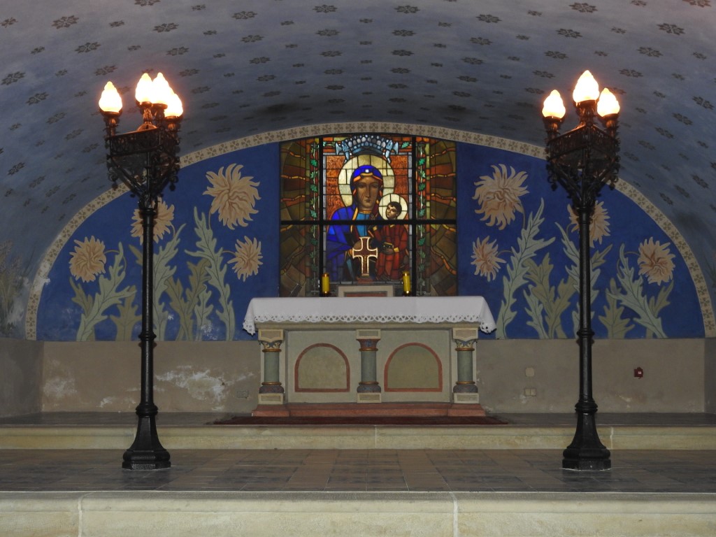 W prezbiterium krypty, również nakrytym kolebkowym sklepieniem o obniżonym łuku, oddzielonym od nawy gurtem, wspartym na dwóch parach neoromańskich kolumn, znajduje się neoromański ołtarz wykonany według projektu Tomasza Prylińskiego, a w ścianie głównej naprzeciwko wejścia witraż przedstawiający Matkę Boską Częstochowską, zaprojektowany przez Adama Bunscha.