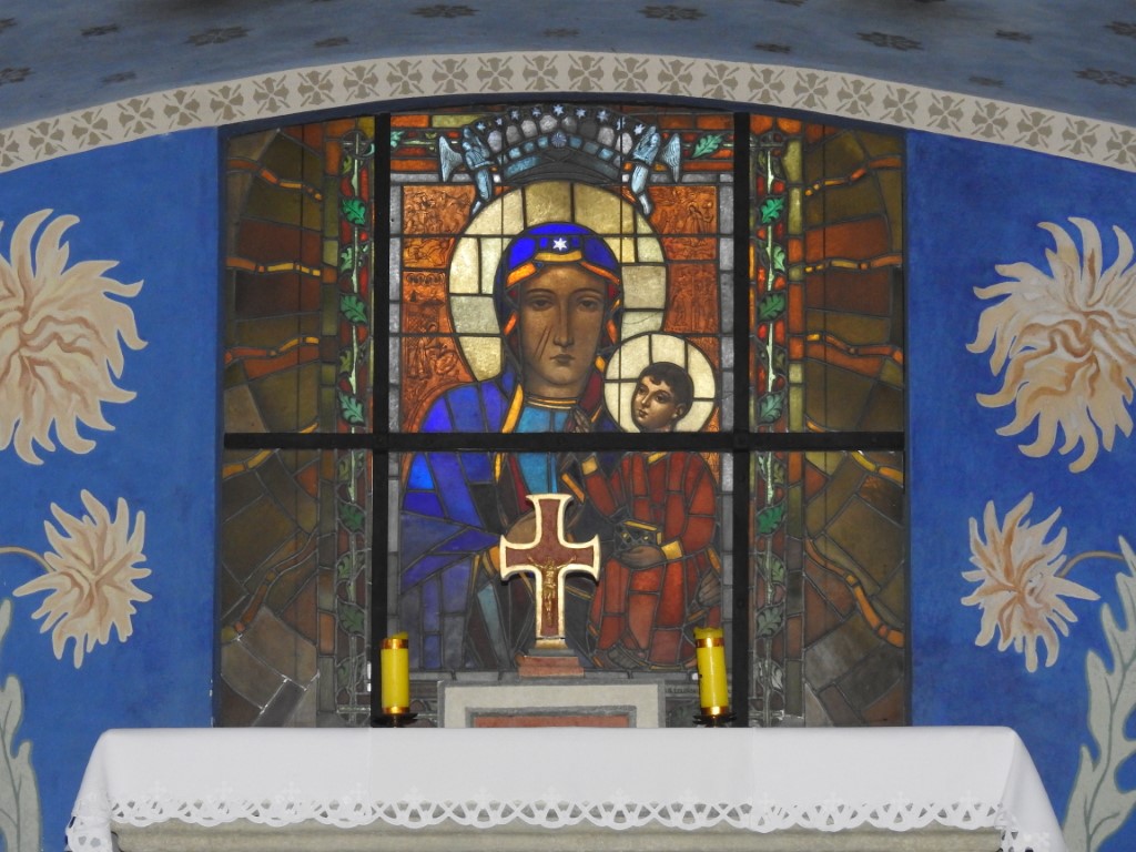 - Witraż: Ścianę główną naprzeciwko wejścia zdobi witraż przedstawiający Matkę Boską Częstochowską, co podkreśla związek miejsca z zakonem paulinów.